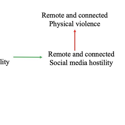 In my #JMP, I show local aggressive tweets increase geographically distant but online connected regions crimes. I build a three-step causal chain. [1/6]