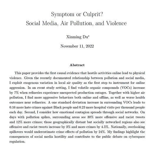 Second, surrounding areas see 30% more offensive and racist tweets on air pollution spike days.
