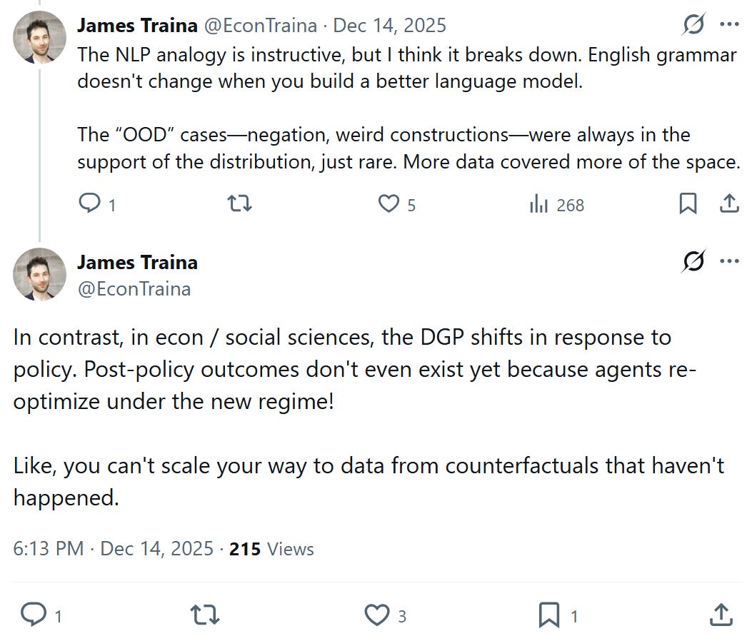 ^longer thread on this claim here, “You can’t scale your way to data from counterfactuals that haven’t happened”.