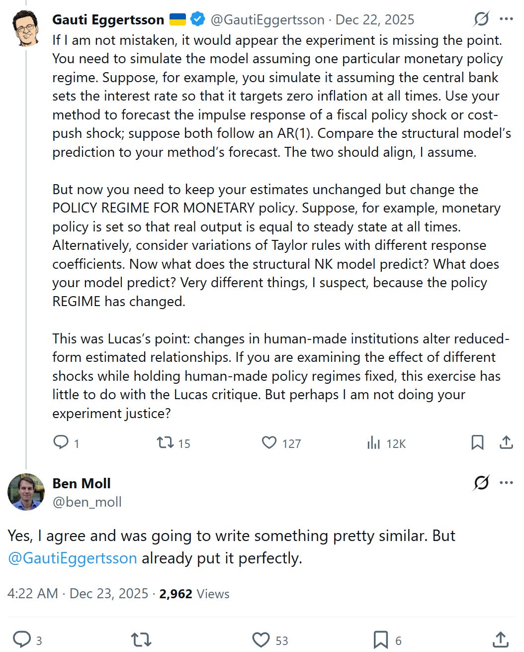 Do note these econometric claims are, I think?, different from the Lucas critique. See especially Nathaniel Bechhofer’s comments below. Here’s a useful, simple concrete example of the Lucas critique.