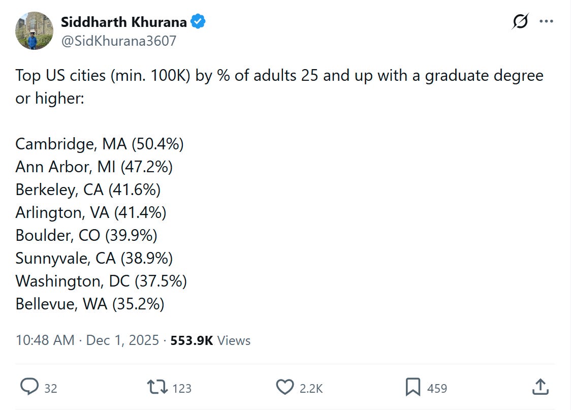 US cities ranked by graduate degree holders