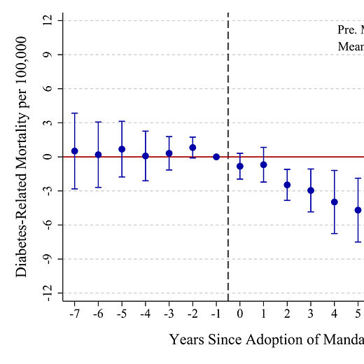 State-mandated health insurance benefits for diabetes save lives, specifically from diabetes-related deaths, by 3.1 per 100,000 annually.