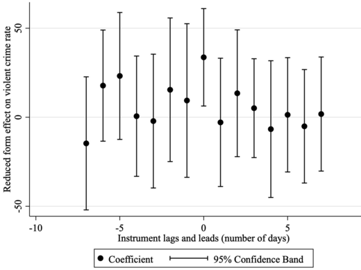 Evidence from changes in landing direction at airport shows that it is 4.1 decibels louder on days when aircraft pass over municipalities and violent crime rates increase by 6.6%.
