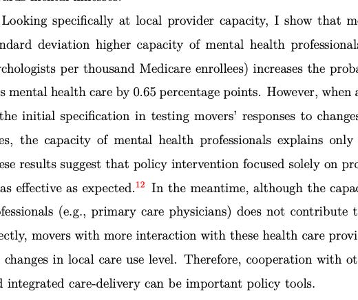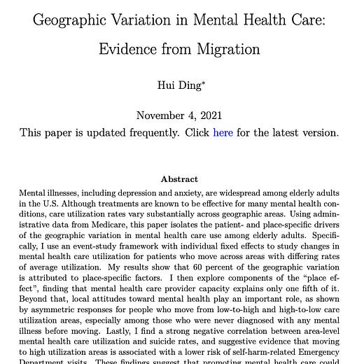 Really fascinating JMP here by Hui Ding shows place based effects on mental illness, part of which can be attributed to provider capacity constraints.