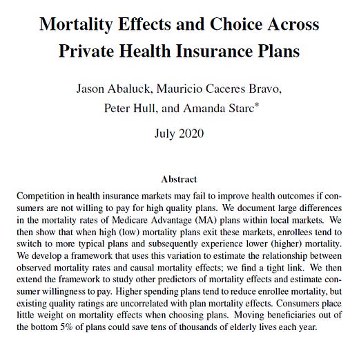 NEW PAPER: Some insurance plans increase beneficiary mortality, but consumers (mostly) can’t tell which ones. Getting rid of the worst 5% of Medicare Advantage plans could save 10,000 lives/year …d1a-wp-offload-media.s3.amazonaws.com/faculty/wp-con… (w/ @autoregress, @AmandaStarc1, and @mmcaceresb