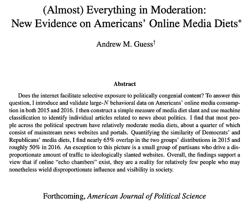 My paper "(Almost) Everything in Moderation: New Evidence on Americans' Online Media Diets" is forthcoming at AJPS🥳. I use surveys and web visit data + a machine classifier to study online news consumption in 2015-2016. Get ready for a THREAD!