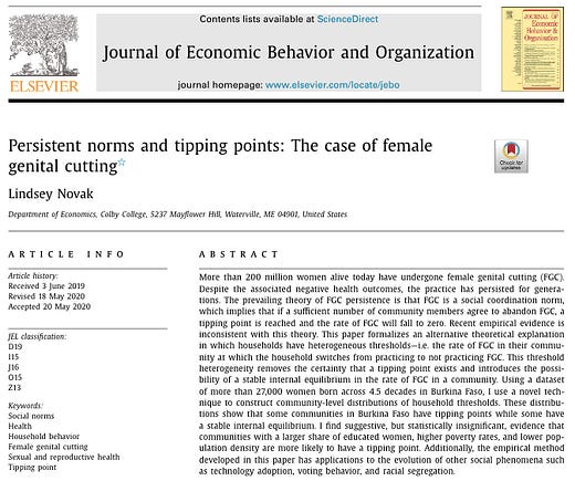 My paper, Persistent Norms and Tipping Points: The Case of Female Genital Cutting, is out in JEBO! CliffsNotes version in thread.