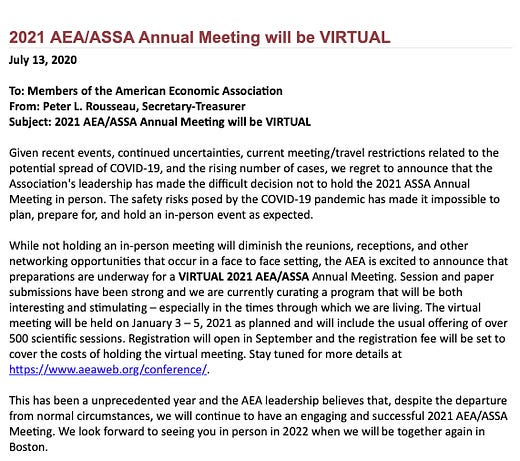 Ugh, there it is. #ASSA2021 will be virtual. Not surprising, but still sad.