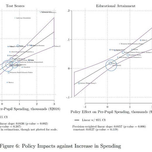 @c_mackevicius. Consistent pos relationship between spending and better outcomes in credibly causal studies. Robust to many modeling decisions, "fixes" for publication bias, and even confounding.