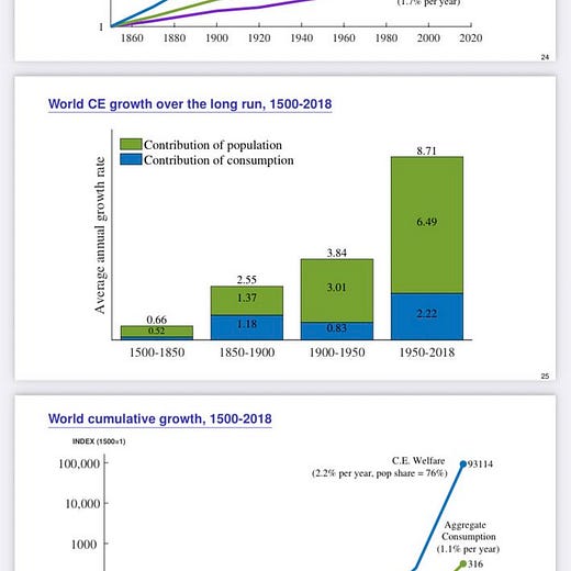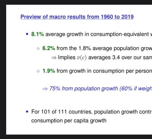 Interesting set of slides from @ChadJonesEcon estimating that ~75% of global welfare growth over the past centuries has been population growth rather than income per capita growth: web.stanford.edu/~chadj/slides-…