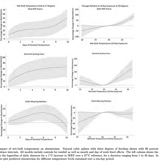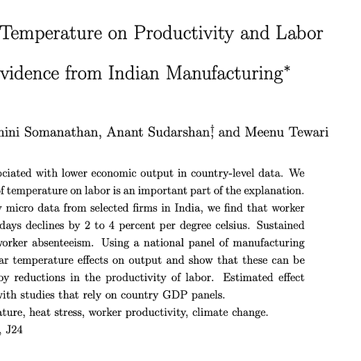 The cross-country relationship between heat and lower GDP is corroborated by daily fluctuations in wet-bulb temp in India, reducing labor supply + productivity of manufacturing firms.