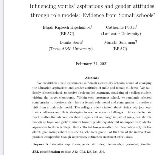 Make & female college students visited primary schools in Somalia. Female RMs impacted students’ attitudes toward gender equality. No impact on education aspirations.