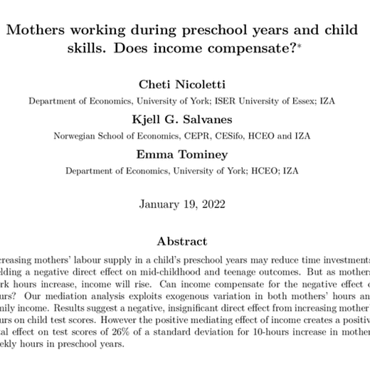 For #InternationalWomensDay a new study showing that when mothers work during preschool years it has no impact on children's education outcomes (age 15).