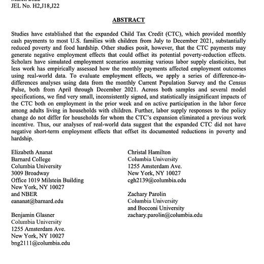 "Our analyses suggest that the expanded CTC did not have negative short-term employment effects that offset its documented reductions in poverty and hardship."