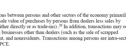 Answer to below: Exports⬆️, consumption (PCE)⬇️ due to intersectoral net transactions, GDP unchanged. This treatment creates the possibility that PCE could be negative, if U.S. households sold enough cars to foreigners and didn't buy anything else! From bea.gov/resources/meth…: