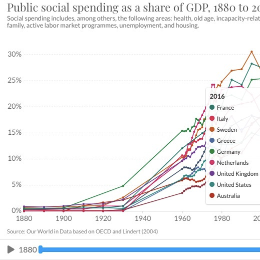 Was looking back the famous Alesina-Glaeser paper on America lacking welfare state due to racism. Was curious to see their discussion of Canada, without same slavery legacy. They say Canada has comp gov to W Europe. But now, Canada looks similar to US in spending