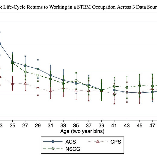 STEM majors start out with a sizable wage premium, but this goes down over time since tech requires frequent upskilling.