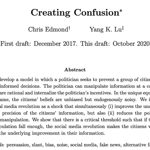 Here's a new version of "Creating Confusion" (just accepted by JET) on the politics of disinformation, joint with Yang Lu. 1/