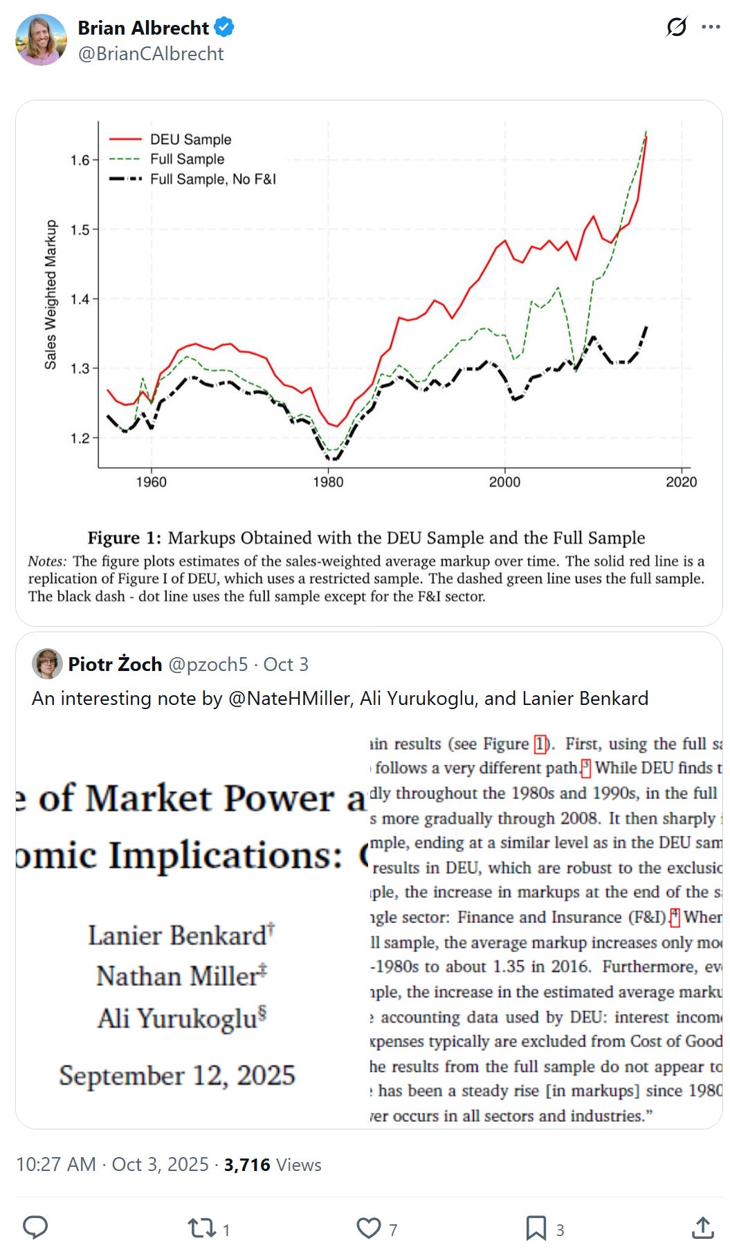 Second, unlike the results in DEU, which are robust to the exclusion of individual sectors, in the full sample, the increase in markups at the end of the sample is driven almost entirely by a single sector: Finance and Insurance (F&I).4 When the F&I sector is excluded from the full sample, the average markup increases only modestly, from just below 1.30 in the mid-1980s to about 1.35 in 2016