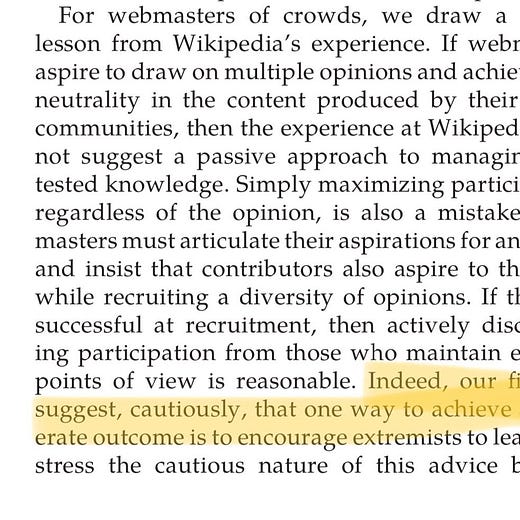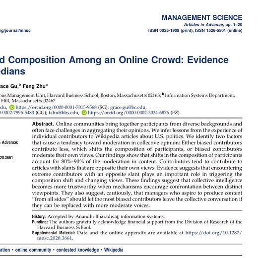 Vital paper that shows why Wikipedia achieves a moderate consensus on topics while Twitter & Facebook do not. Wikipedia does not filter what users see, so each article is exposed to different views. Then it subtly encourages extremists to leave, retaining moderate content & users