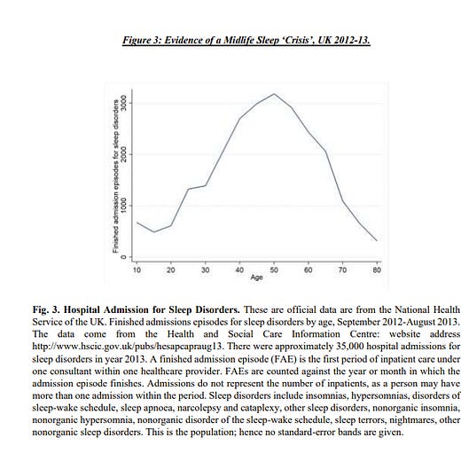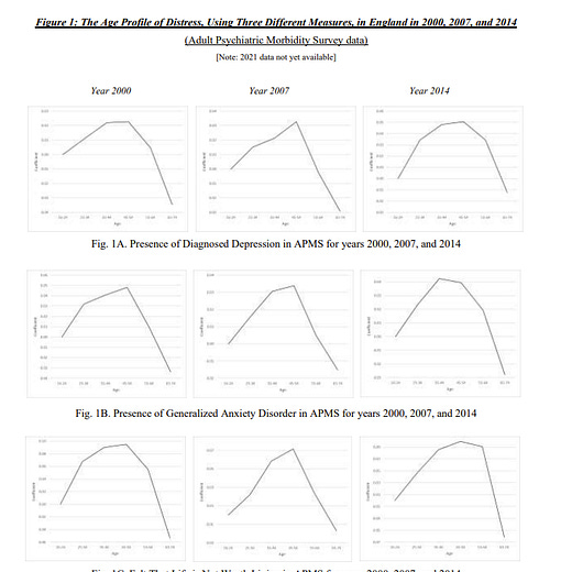 Using data on midlife suicide,sleeping problems, alcohol dependence, concentration difficulties, memory problems, intense job strain, disabling headaches, suicidal feelings, and extreme depression, we document a longitudinal crisis of midlife among the inhabitants of rich nations